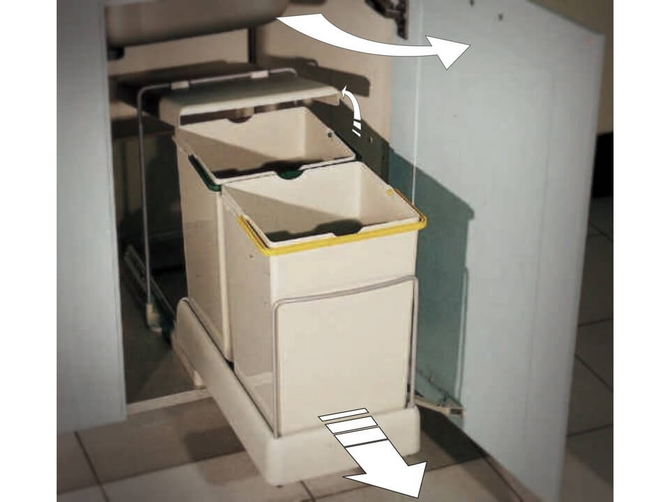 🛠️ Montaj pe ușă (manual): sistemul se fixează în interiorul corpului, cu prindere pe ușa mobilierului, iar recipientele se extrag manual la deschiderea ușii.