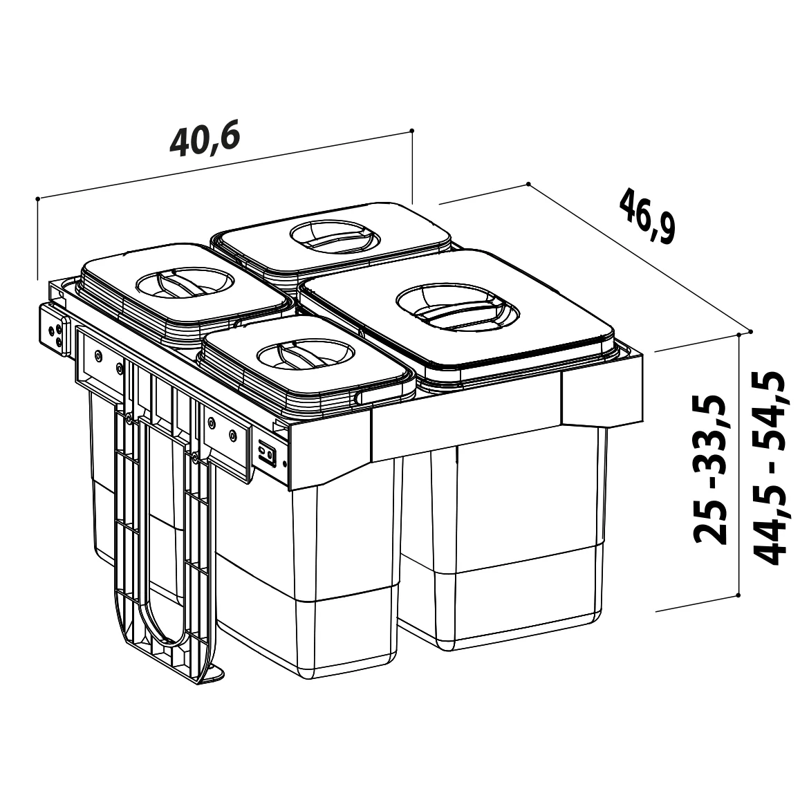 Datorită dimensiunilor sale, este ideal pentru corpuri de bucătărie de dimensiuni medii, sub chiuvetă sau corpuri dedicate colectării selective.