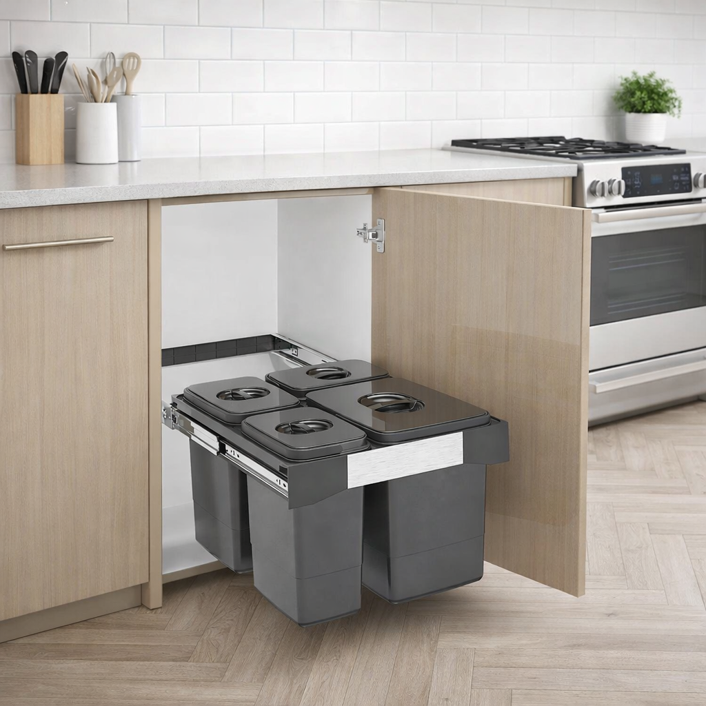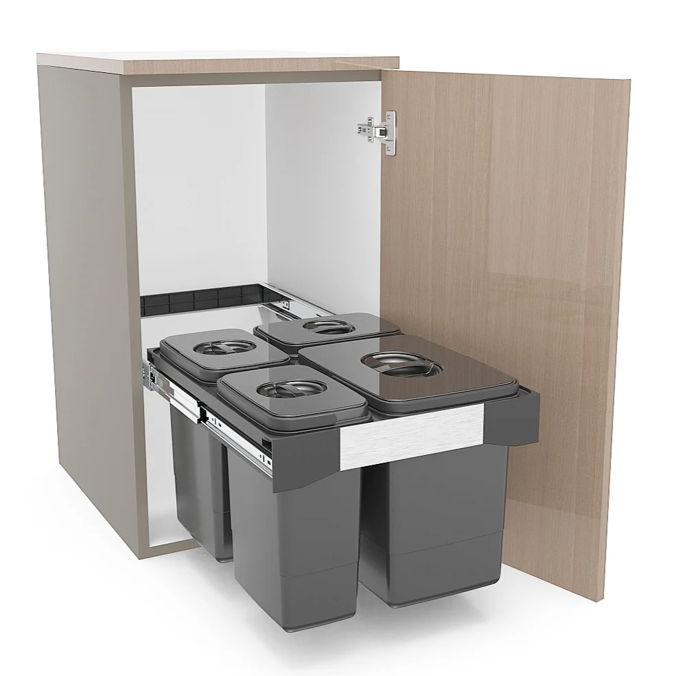 🛠️ Montaj pe ușă (manual): sistemul se fixează în interiorul corpului, cu prindere pe ușa mobilierului, iar coșurile se extrag manual la deschiderea ușii.