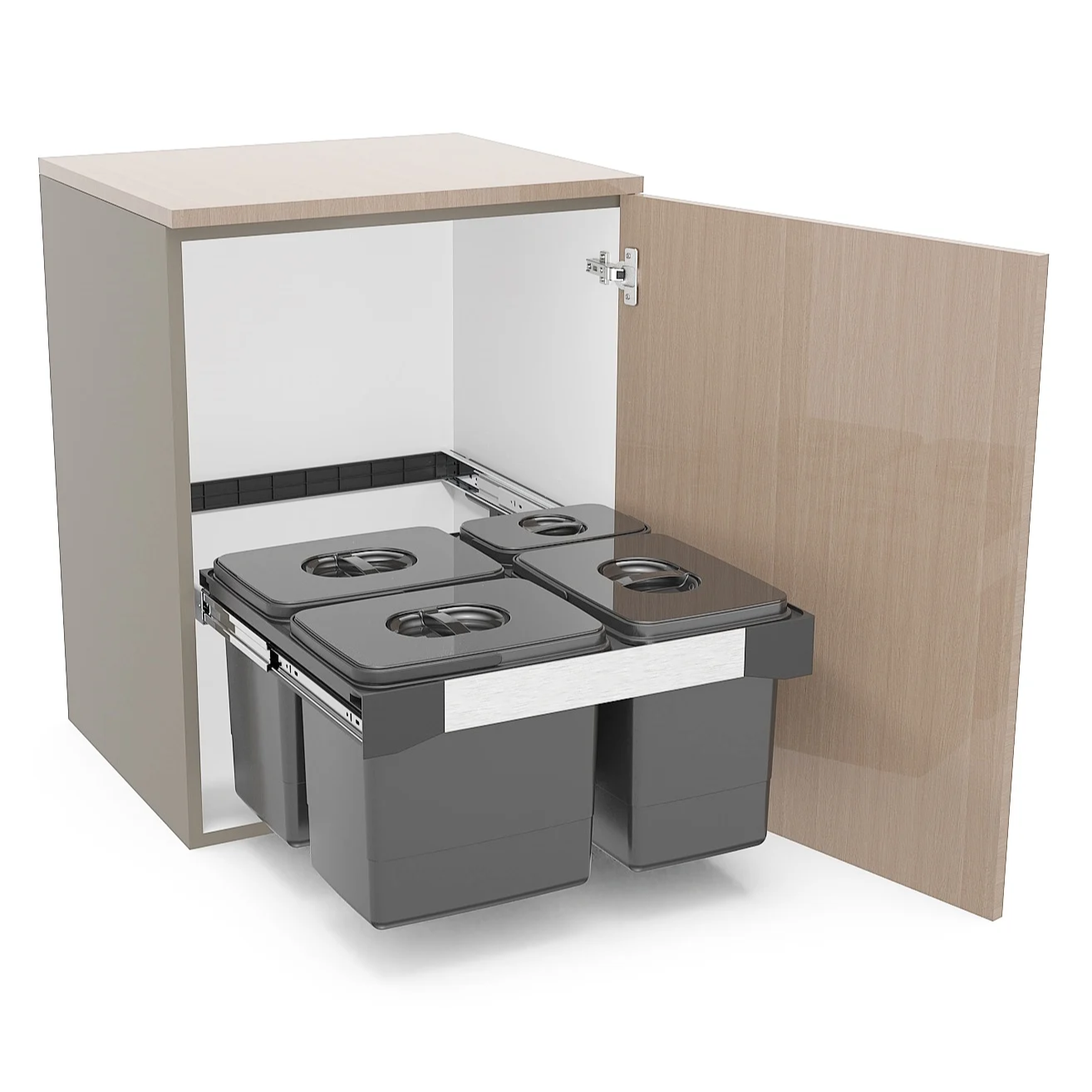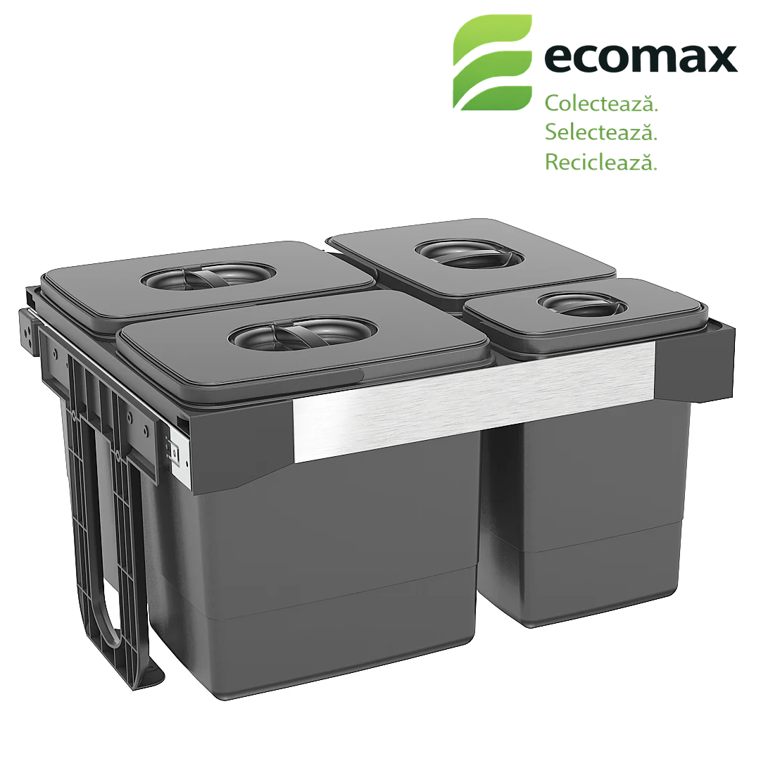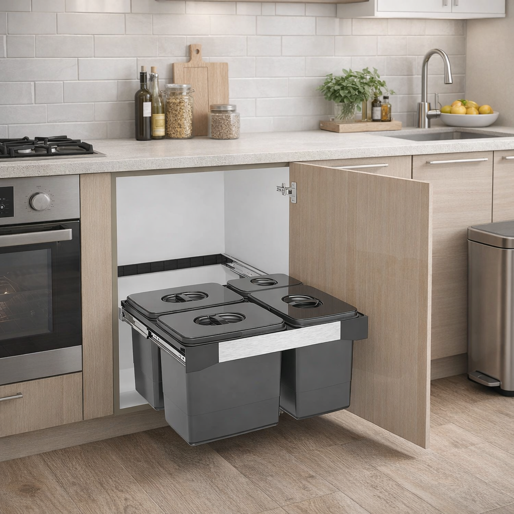 🛠️ Montaj pe ușă (manual): sistemul se fixează în interiorul corpului, cu prindere pe ușa mobilierului, iar coșurile se extrag manual la deschiderea ușii.