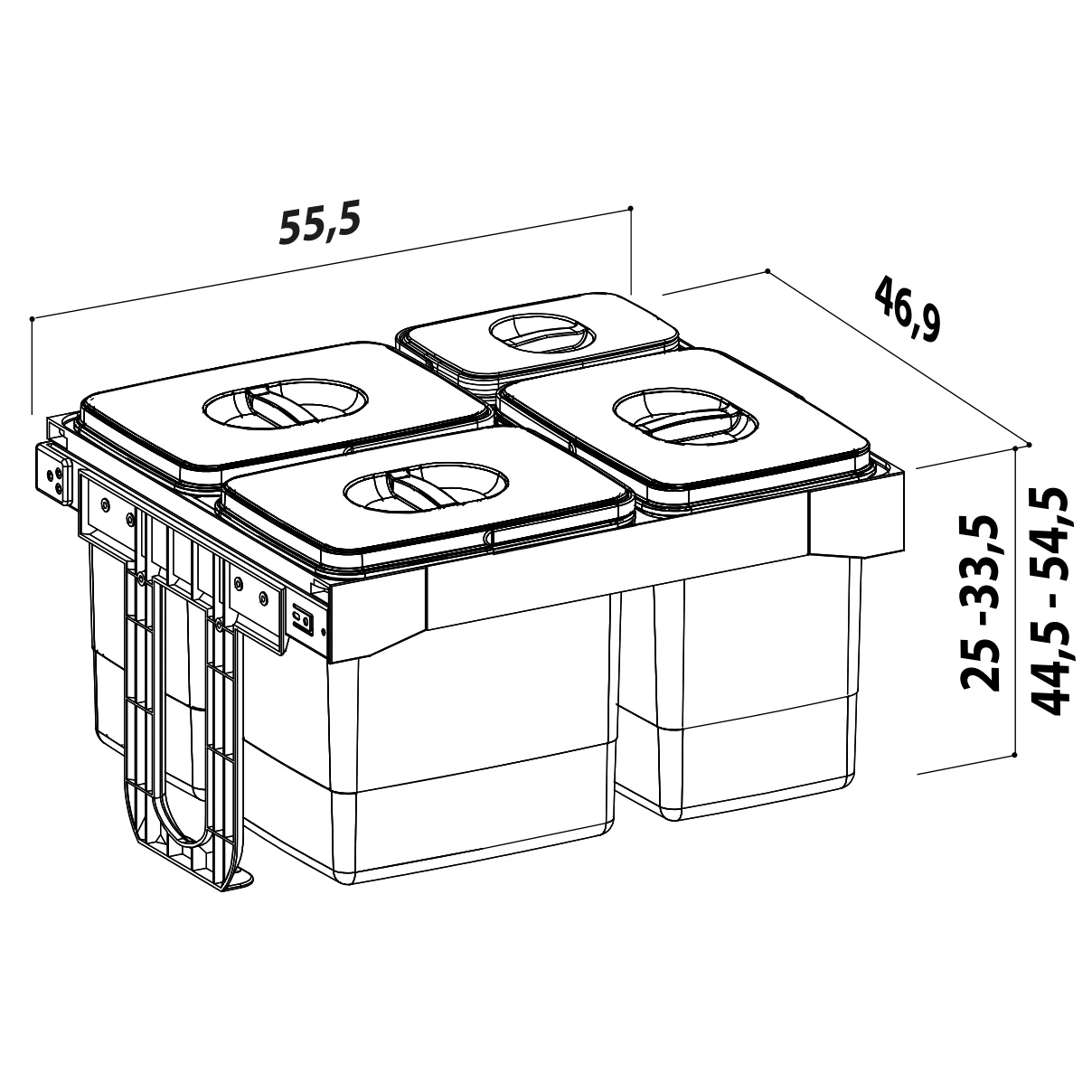 Se fixează în interiorul corpului, cu prindere pe ușa mobilierului, iar coșurile se extrag manual.
