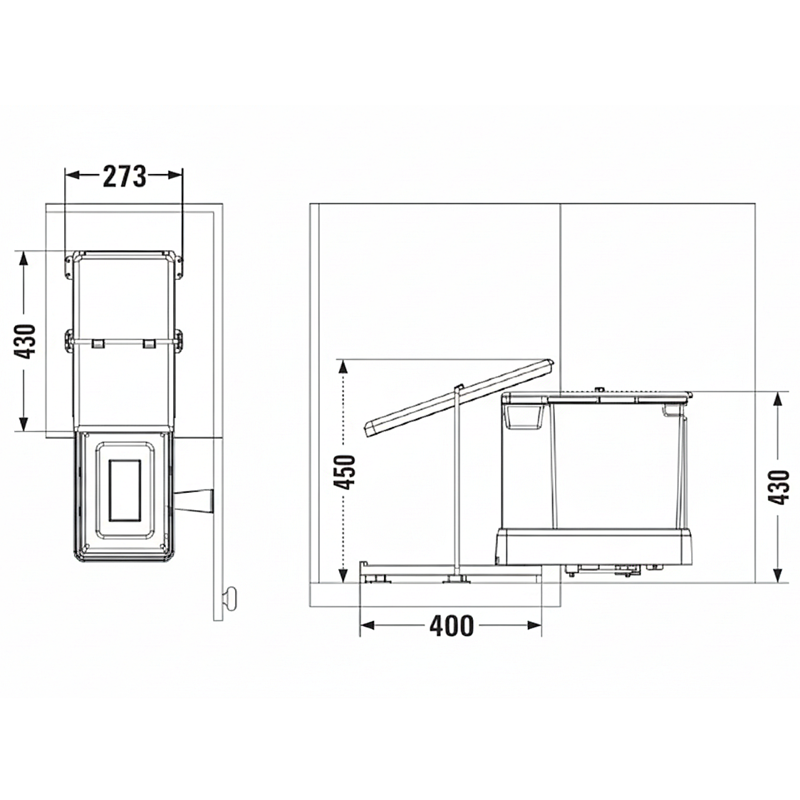 Mecanismul de extragere automată permite ca, la deschiderea ușii corpului de mobilier, coșurile să gliseze automat în exterior, fără acționare manuală. Dimensiunile sale compacte — L 430 mm, l 273 mm, H 430 mm — permit montajul ușor în majoritatea corpurilor standard de bucătărie.