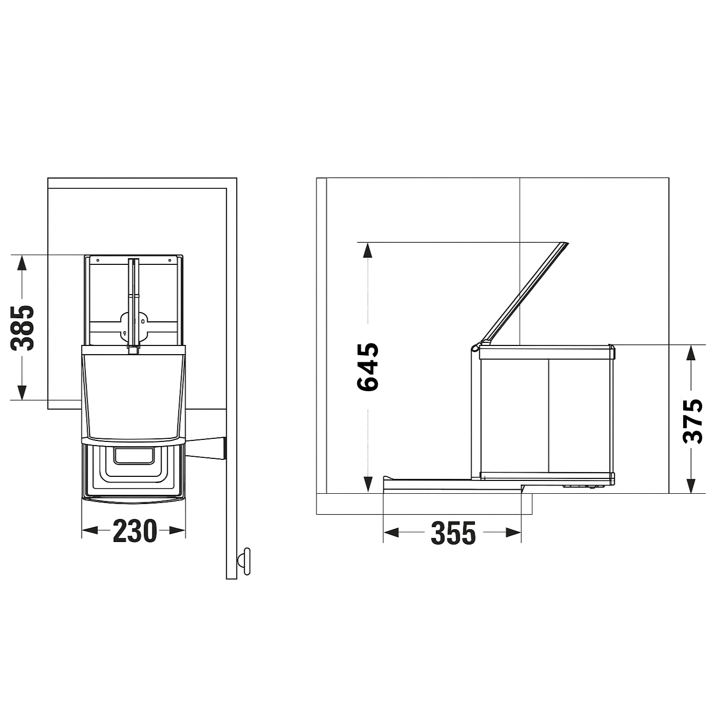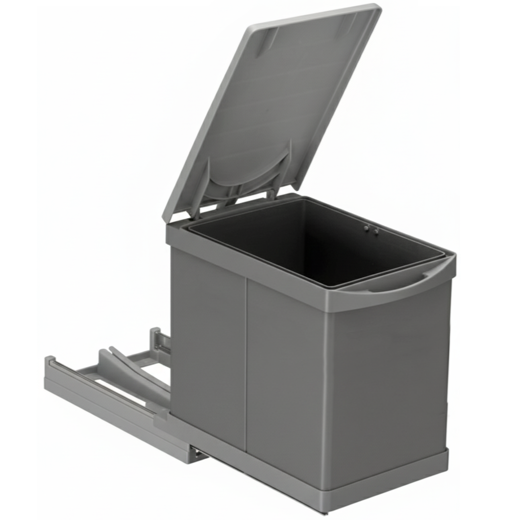 Capacitatea de 16 L este perfectă pentru utilizare zilnică în apartamente, bucătării mici sau ca sistem secundar pentru colectare selectivă. Dimensiunile sale compacte — L 385 mm, l 230 mm, H 375 mm — permit montajul în majoritatea corpurilor standard de bucătărie, inclusiv sub chiuvetă.