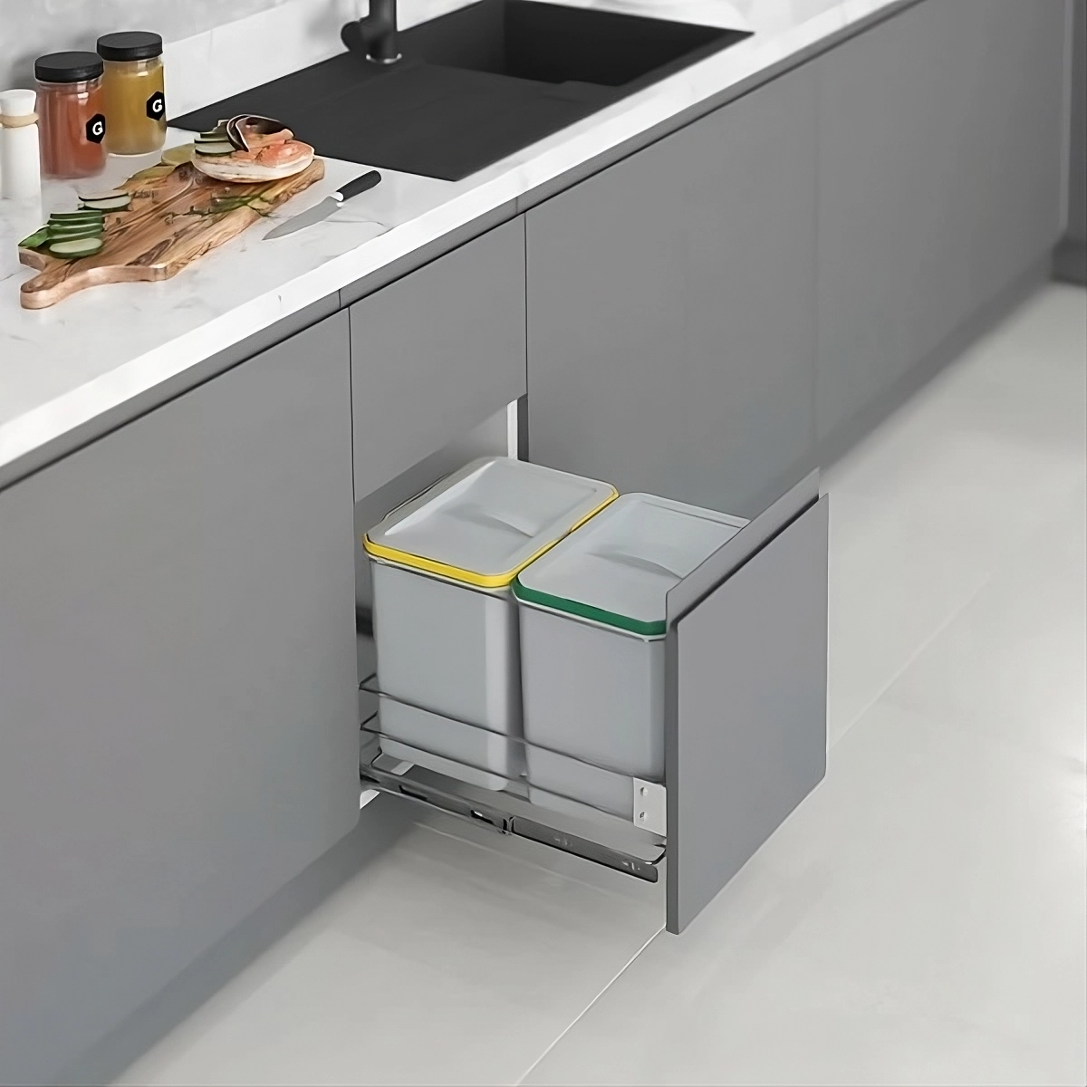 Coșul de gunoi încorporabil S-2582-G, cu două compartimente a câte 6 litri, este soluția compactă și eficientă pentru colectare selectivă în bucătăriile moderne cu spațiu limitat. Capacitatea totală de 12 litri este ideală pentru separarea deșeurilor menajere de cele reciclabile ușoare (plastic, ambalaje).