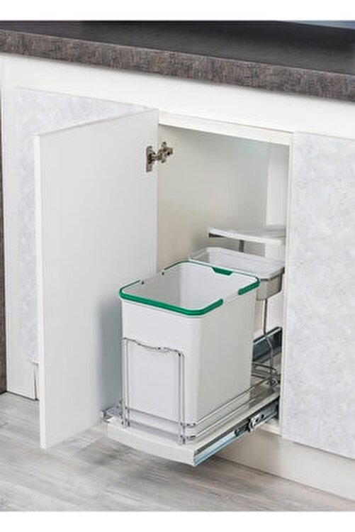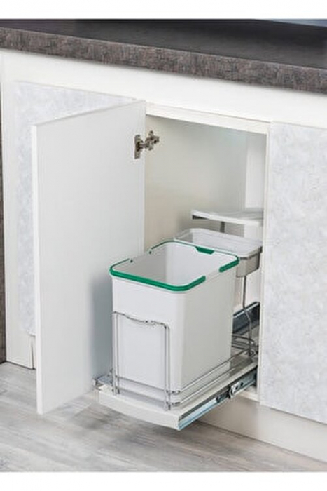 Datorită mecanismului de extragere automată, coșul se deschide simultan cu ușa mobilierului, oferind un acces rapid, igienic și fără efort. Este realizat din metal și plastic rezistent, în finisaj gri deschis, asigurând durabilitate și stabilitate în utilizarea zilnică.