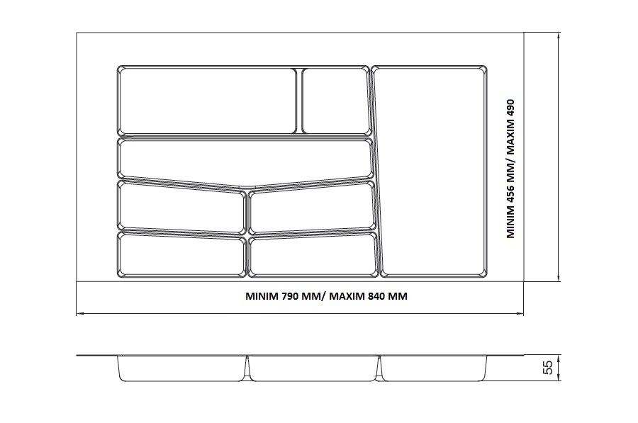 Produsul este prevăzut cu margini ajustabile, decupabile, care permit adaptarea precisă la dimensiunile interioare ale sertarului. Această caracteristică optimizează spațiul disponibil, elimină golurile laterale și contribuie la stabilitatea organizatorului în utilizarea zilnică.
