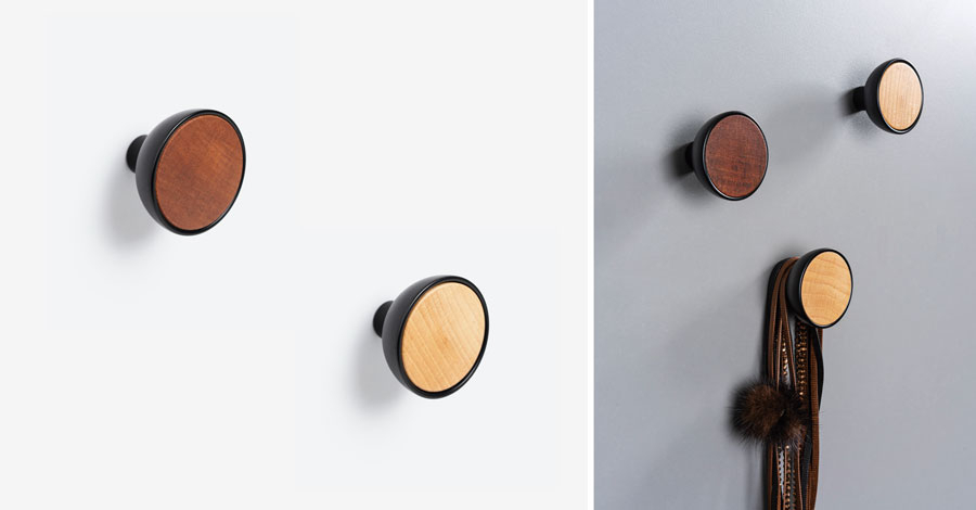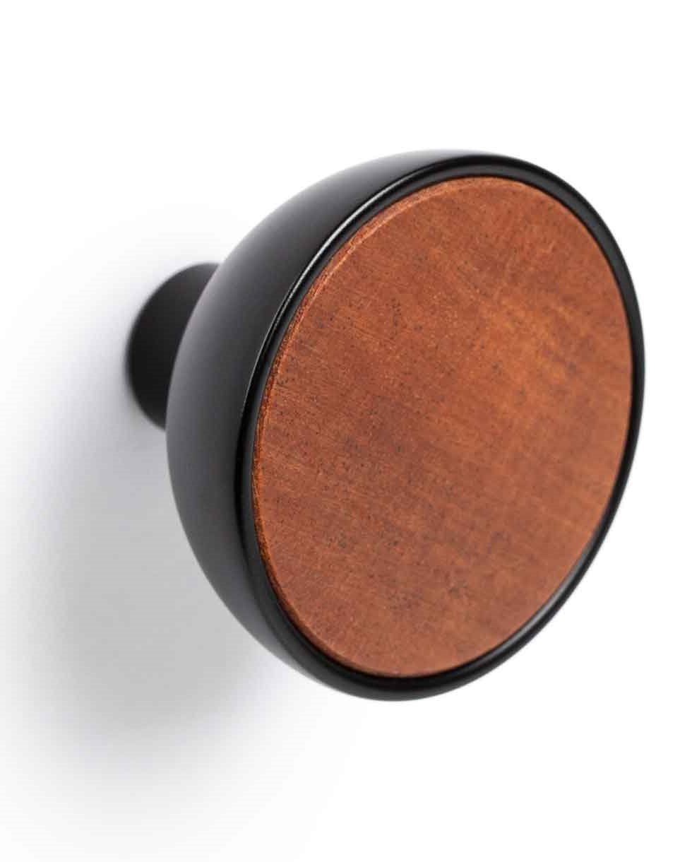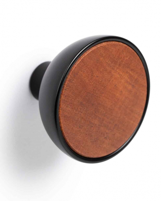 Oferă design decorativ organic, combină zamak negru mat cu lemn sapelli natur, are formă netedă protectivă pentru textile, dimensiune compactă și montaj rapid cu șurub inclus, adăugând un accent industrial rafinat.