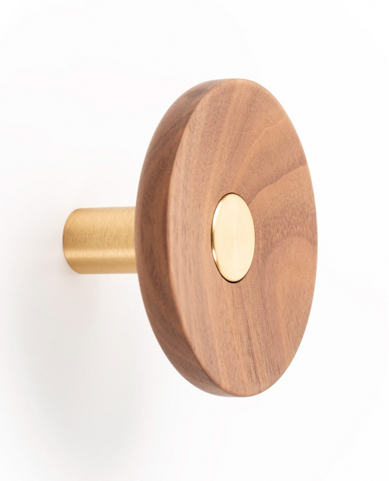 Oferă design rotund decorativ Ø90 mm, combină alamă întunecată periată cu lemn nuc natur, permite aranjamente modulare personalizate, are construcție solidă și montaj rapid cu șurub inclus, adăugând un accent elegant contemporan.