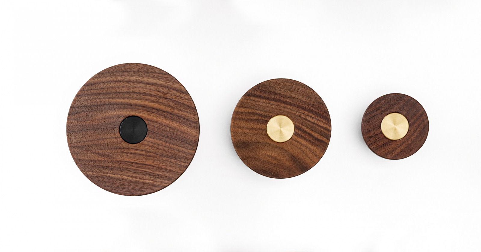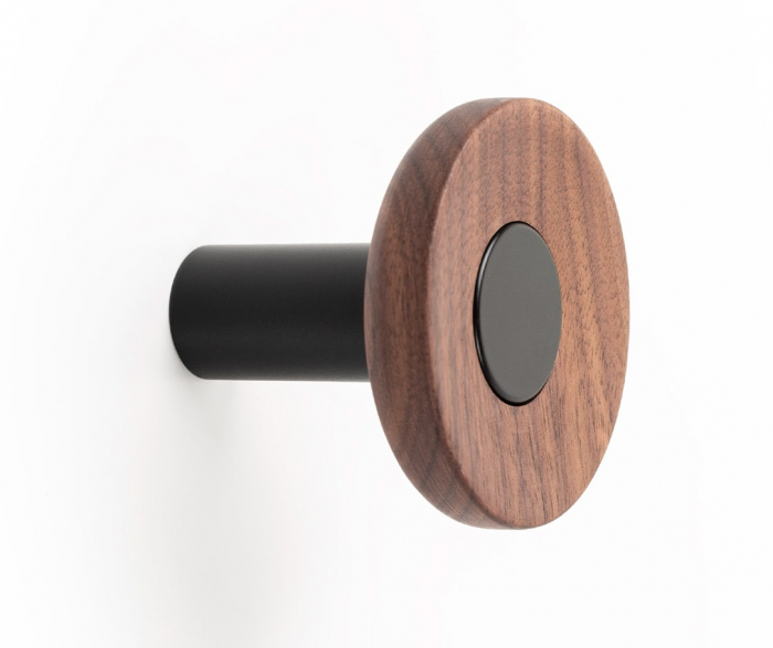 Oferă design rotund compact Ø60 mm, combină aluminiu negru mat cu lemn nuc natur, permite aranjamente modulare personalizate, are construcție solidă și montaj rapid cu șurub inclus, adăugând un accent contemporan cald.