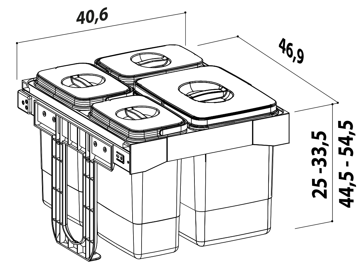 Cosul de gunoi poate fi montat in sertar de minim 410 mm latime, minim 470 mm adancime si minim 550 mm inaltime.