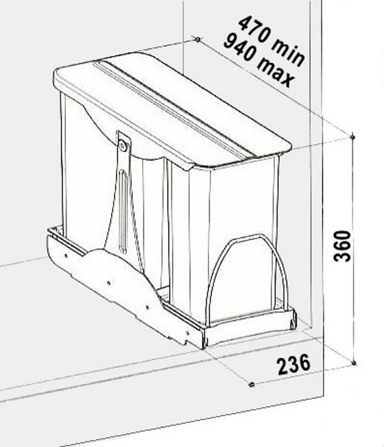 Acest sistem de cosuri este potrivit pentru corp de mobilier cu o inaltime interioara de minim 360 mm, cu latimea interioara de minim 240 mm si cu adancimea interioara a corpului de minim 475 mm.