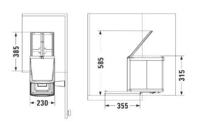 Acest cos de gunoi este potrivit pentru corp de mobilier cu o inaltime interioara de minim 350 mm, cu latimea interioara de minim 280 mm si cu adancimea interioara a corpului de minim 415 mm.