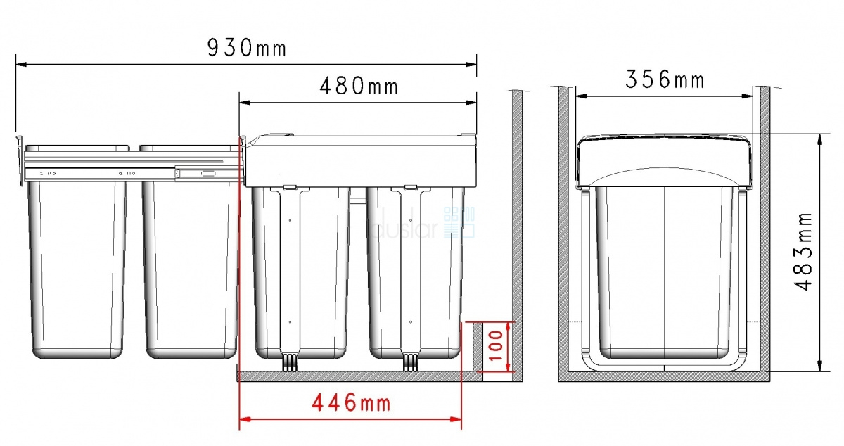 Cosul de gunoi poate fi montat in corp cu adancime de minim 500 mm, latime de minim 376 mm si inaltime de minim 503 mm.