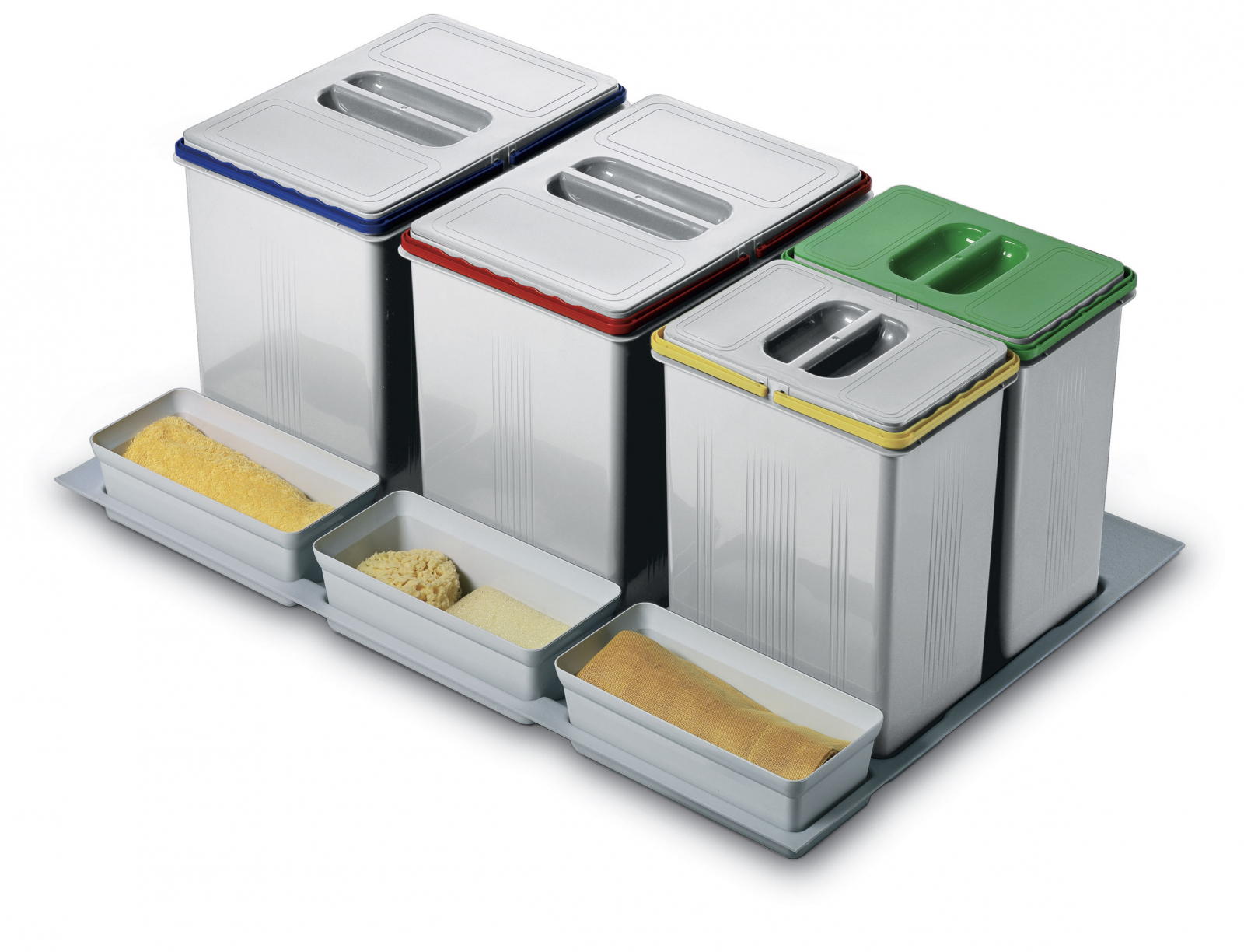 Sistemul de cosuri de gunoi pentru sertare este ideal pentru colectarea selectiva a deseurilor. Este compus din 2 recipiente de 16 litri, 2 recipiente de 7.5 litri si trei tavite. Este prevazut cu o tavita suport pentru stabilitate si este foarte usor de curatat. Acest sistem de cosuri este potrivit pentru sertare cu o inaltime interioara de minim 300 mm, cu latimea interioara cuprinsa intre minim 700 mm si maxim 730 mm si cu adancimea interioara a sertarului cuprinsa intre minim 420 mm si maxim 490 mm. Dimensiunile tavitei suport pot fi ajustate prin taiere.