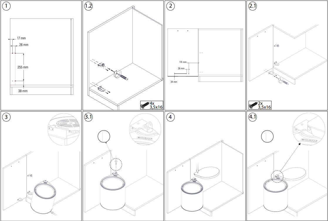 🛠️ Montaj rapid pe ușă: se fixează în interiorul corpului, iar mecanismul capacului se conectează la ușa mobilierului, astfel încât capacul se deschide automat la deschidere.