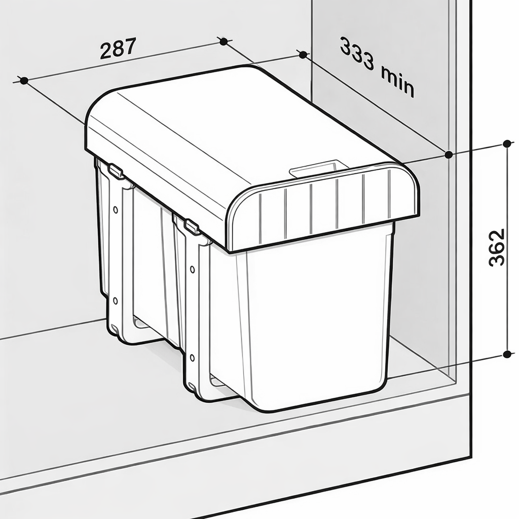 🛠️ Montaj rapid pe ușă (manual): se fixează în interiorul corpului, cu prindere pe ușa mobilierului. Extragerea coșului se face manual, odată cu deschiderea ușii. (Sistemul nu este pe sertar și nu are extragere automată.)