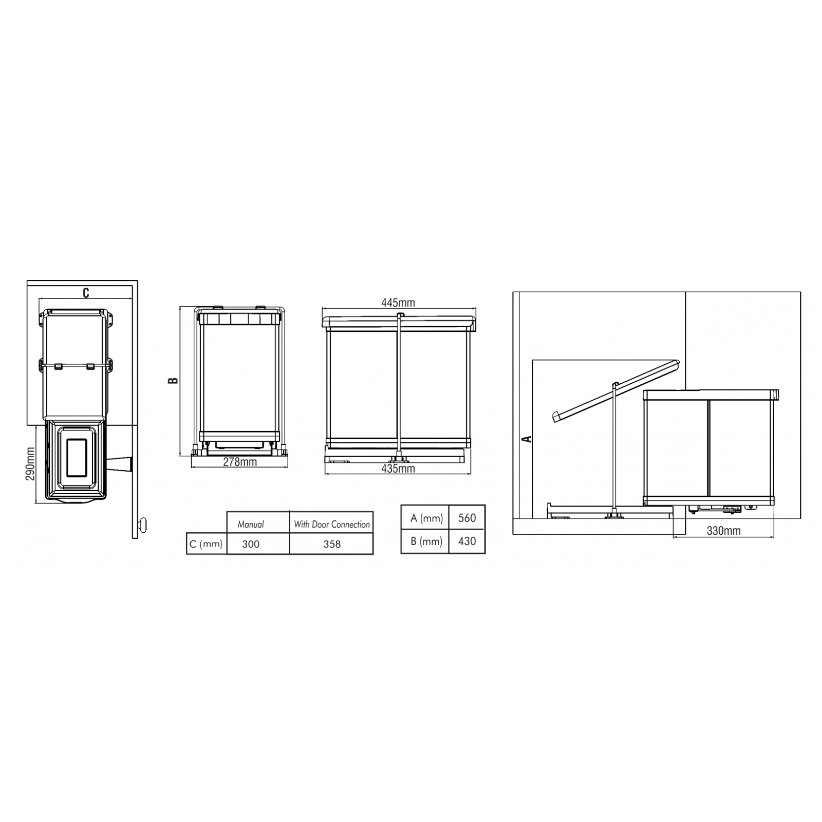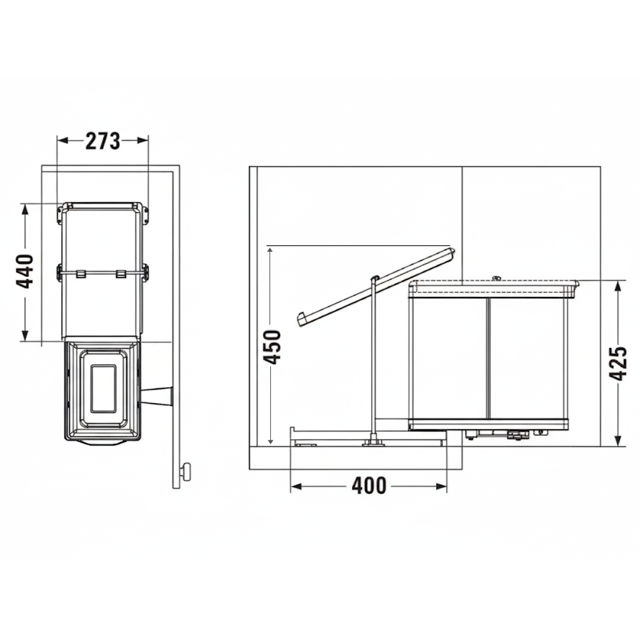 Recipientul principal de 20 L este ideal pentru deșeuri menajere sau reciclabile, iar compartimentul secundar de 1 L este extrem de util pentru resturi mici, capsule de cafea, șervețele sau bureți. Dimensiunile compacte — A 440 mm, l 273 mm, H 425 mm — permit montajul în majoritatea corpurilor standard de bucătărie.