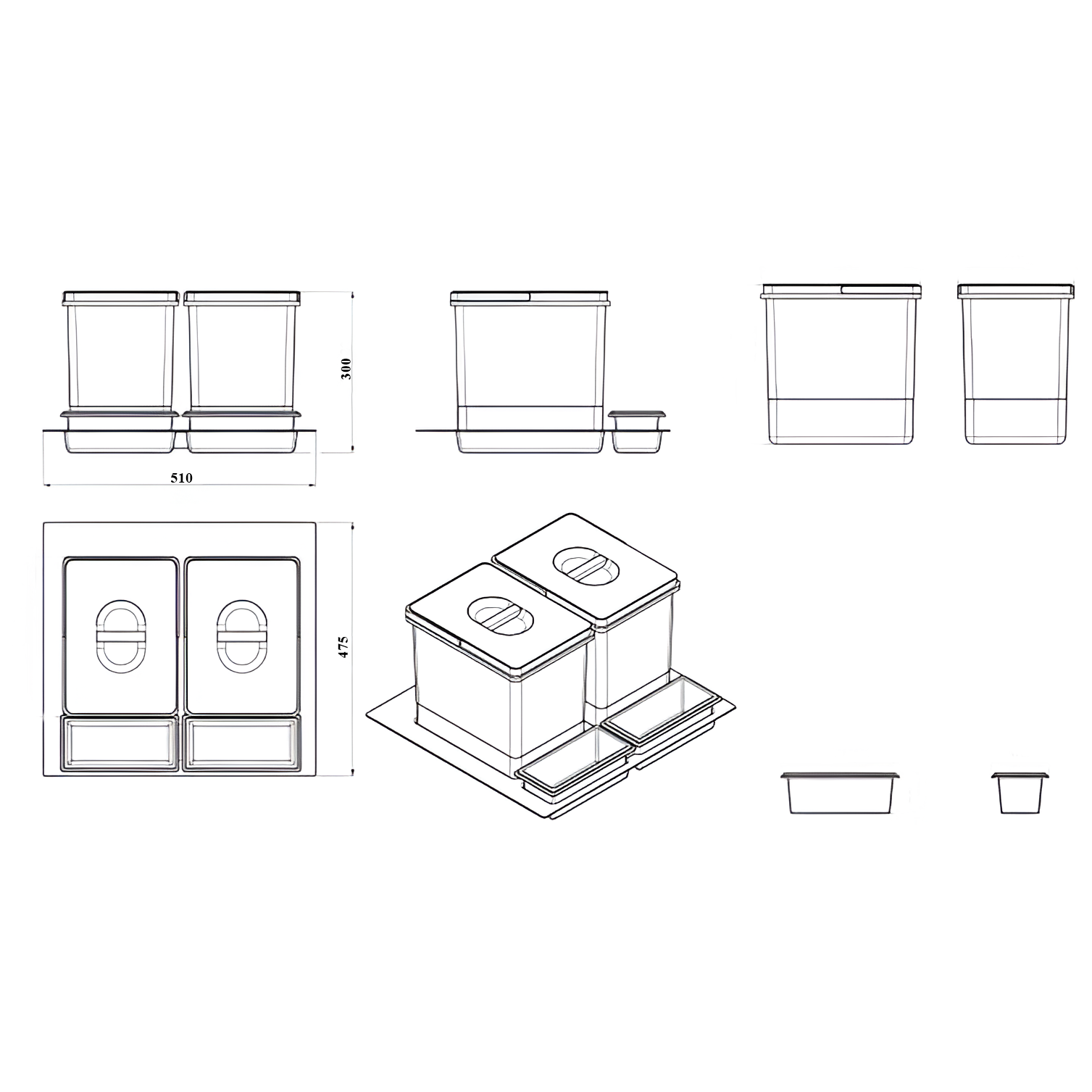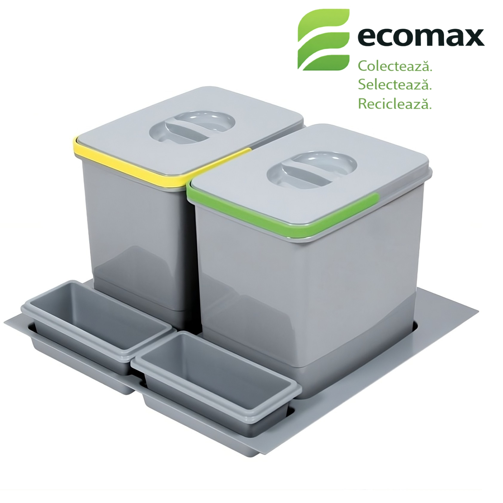 🛠️ Montaj în sertar: Coșurile se fixează direct pe baza sertarului. Accesul la recipiente se face odată cu deschiderea sertarului, fără mecanisme suplimentare.
