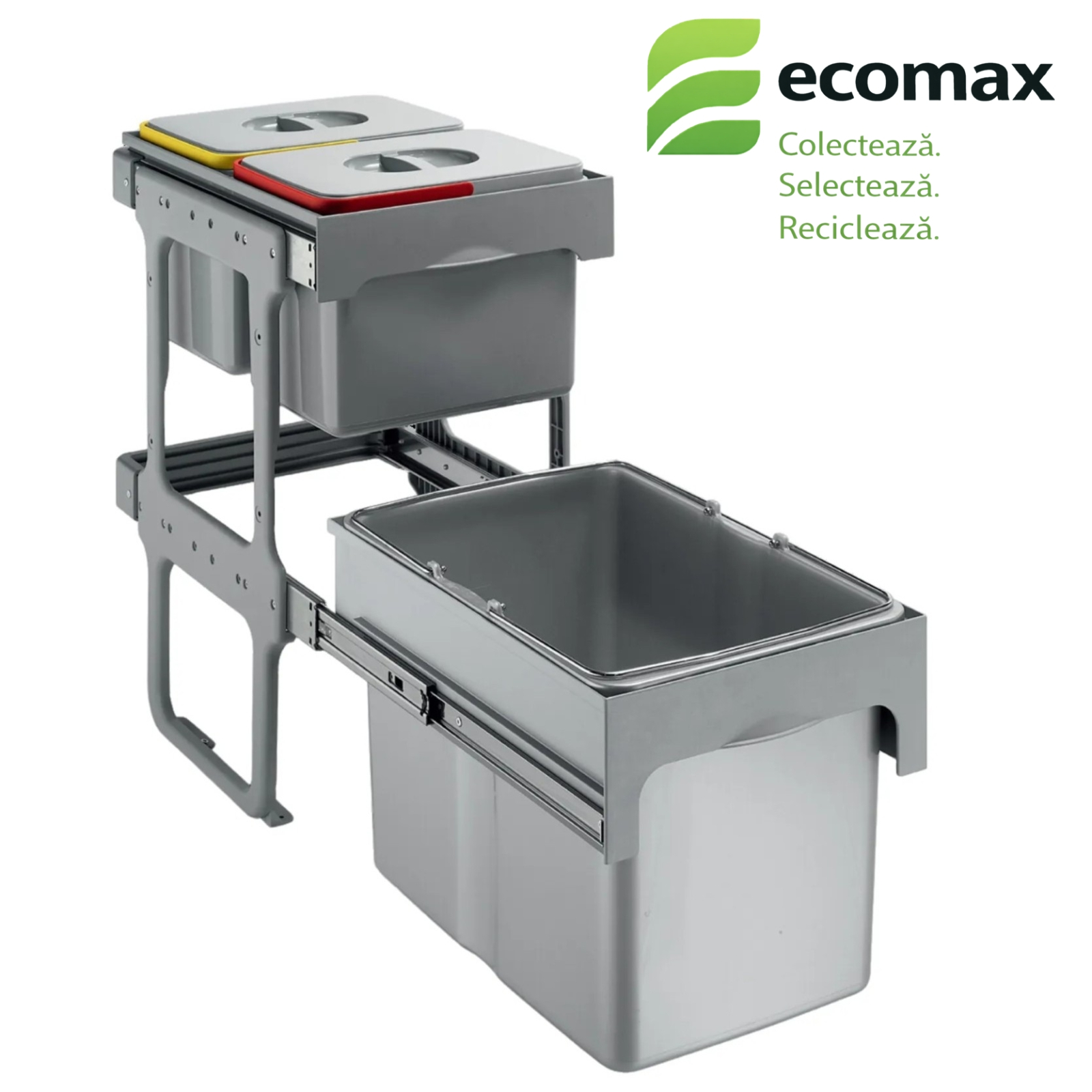 Configurația include 3 compartimente – un recipient de 34 litri și două recipiente de 12 litri, cu o capacitate totală de 58 litri, ideală pentru separarea menajerului de reciclabil.