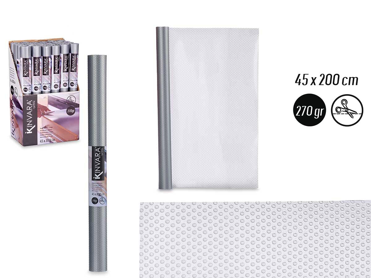 Folie antialunecare 45 × 200 cm, 270 gr, plastic argintiu, ideală pentru sertare mari și rafturi. Protejează suprafețele și stabilizează obiectele. Disponibilă pe vreaumanere.ro.