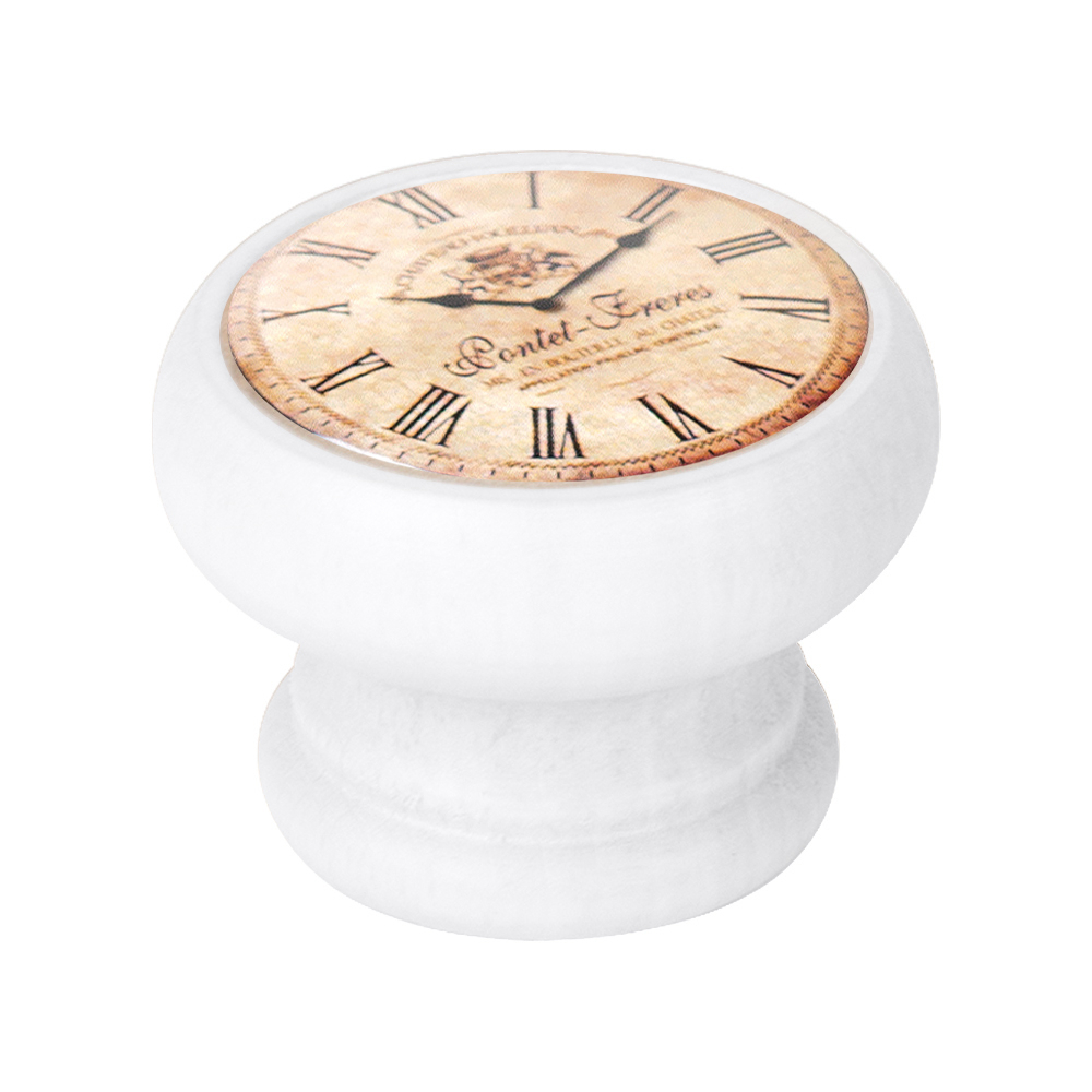 Butonul Clock 5 din colectia Vintage Watches adauga calitati estetice mobilierului si creeaza o atmosfera placuta in spatiile unde este montat. Este un buton unic cu un design vintage cu o forma clasica si accente moderne, care se combina cu cele mai simple medii sau cu cele sofisticate. Liniile subtile si elegante creeaza o fuziune cu toate tipurile de mobilier. Acest model din seria Clock 5 are o baza de lemn cu finisajul alb. Deasemenea este disponibil atat cu baza de lemn cat si cu baza metalica si in finisajele argint invechit, alama antichizata, cupru antichizat, bronz patinat si nuc. Pentru a sigura o prindere corecta si sigura, butonul are inserat o bucsa de alama, in care se va face prinderea cu surub.