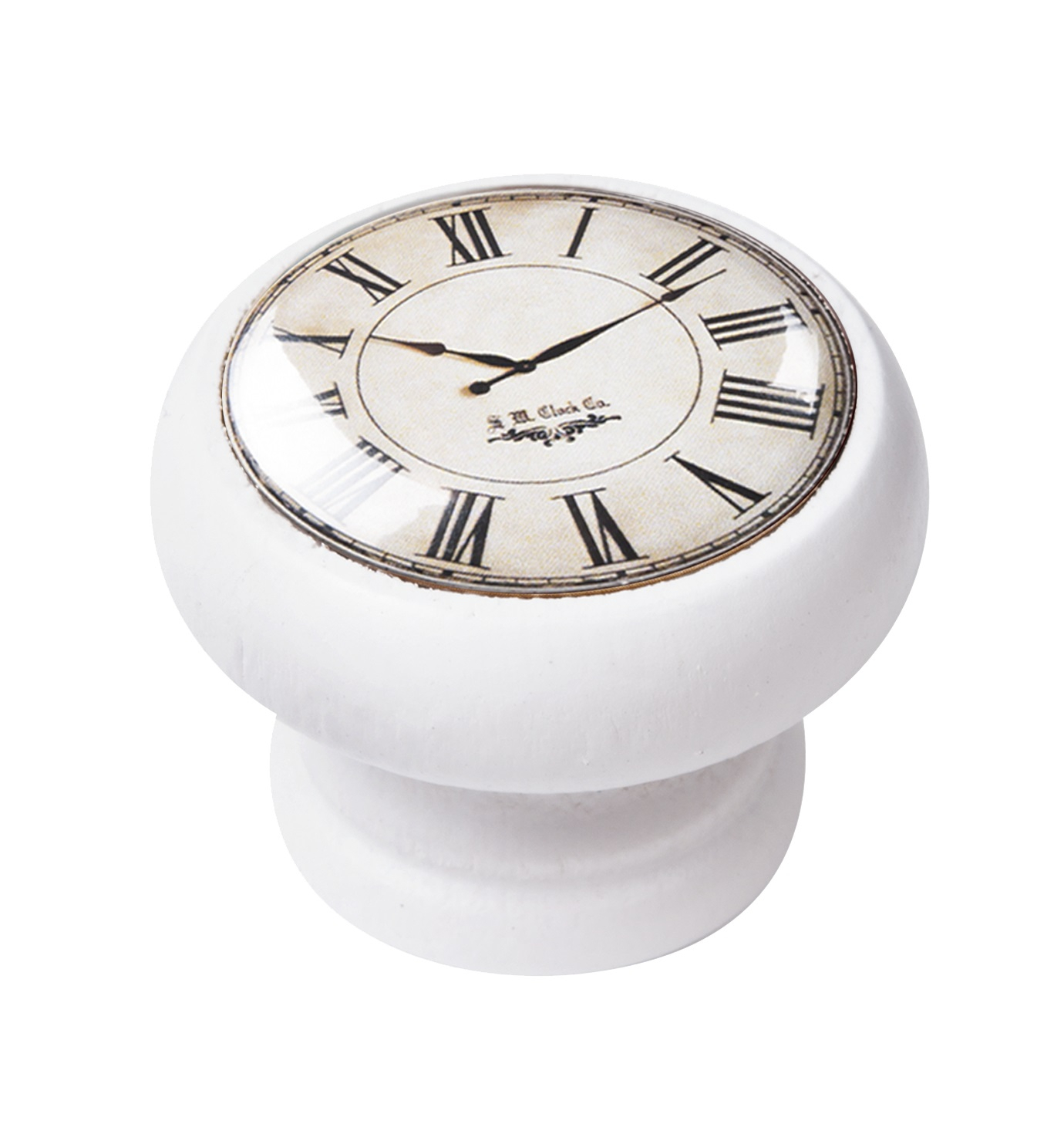 Butonul White Clock din colectia Vintage Watches adauga calitati estetice mobilierului si creeaza o atmosfera placuta in spatiile unde este montat. Este un buton unic cu un design vintage cu o forma clasica si accente moderne, care se combina cu cele mai simple medii sau cu cele sofisticate. Liniile subtile si elegante creeaza o fuziune cu toate tipurile de mobilier. Acest model din seria White Clock are o baza de lemn cu finisajul alb. Deasemenea este disponibil atat cu baza de lemn cat si cu baza metalica si in finisajele argint invechit, alama antichizata, cupru antichizat, bronz patinat si nuc. Pentru a sigura o prindere corecta si sigura, butonul are inserat o bucsa de alama, in care se va face prinderea cu surub.