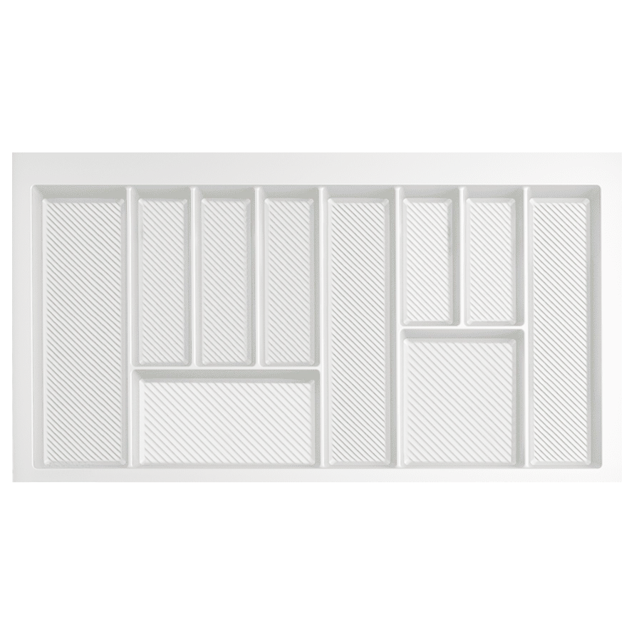 Suportul de organizare tacâmuri Max, cu 10 compartimente, este proiectat pentru organizarea eficientă a tacâmurilor în sertarele de bucătărie, fiind compatibil cu corpuri de 900 mm lățime exterioară. Dimensiunile generoase permit o compartimentare clară pentru tacâmuri și accesorii, menținând ordinea și accesul rapid.