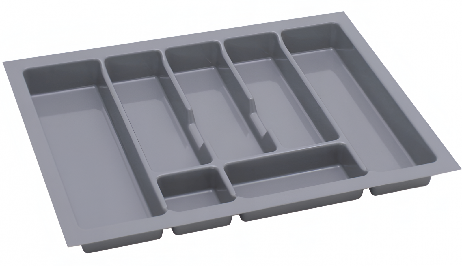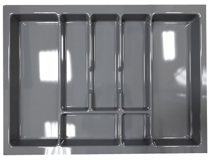 Suportul de organizare tacâmuri Uni, în finisaj gri metalizat, este conceput pentru organizarea eficientă a tacâmurilor în sertarele de bucătărie de dimensiune medie, fiind compatibil cu corpuri de 700 mm lățime exterioară. Suprafața bine proporționată permite o compartimentare clară și ergonomică, ideală pentru utilizare zilnică.