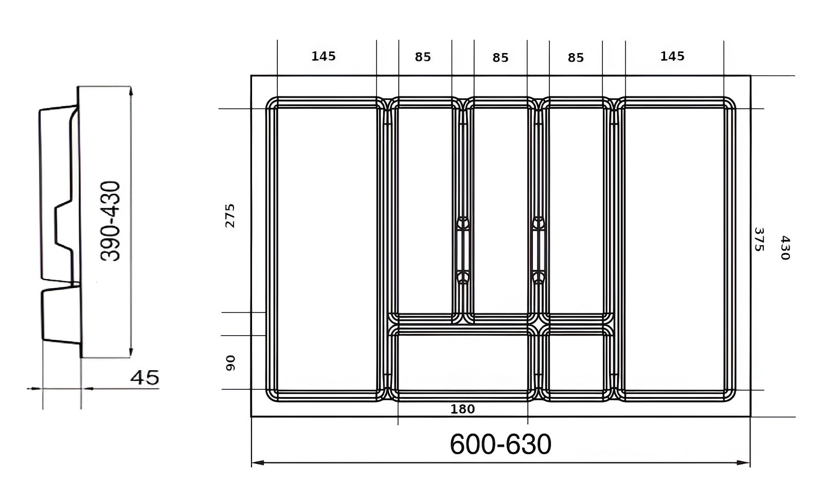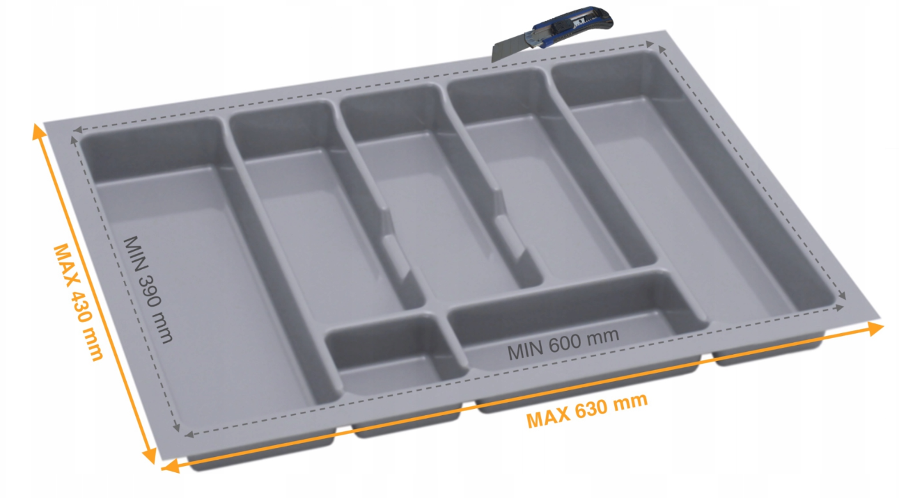 Acest model este prevăzut cu margini ajustabile, care se pot decupa, oferind posibilitatea de adaptare precisă la dimensiunile interioare reale ale sertarului. Această flexibilitate asigură stabilitate, elimină spațiile neutilizate și permite integrarea perfectă în mobilier, chiar și atunci când există mici variații față de dimensiunile standard.