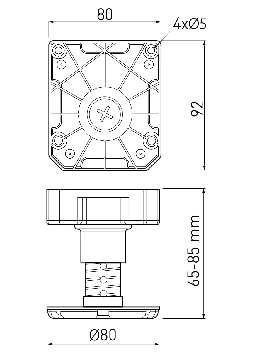 Acest picior reglabil este realizat din plastic rezistent și este conceput pentru o sarcină statică de până la 450 kg per picior. Designul său include o zonă superioară pentru fixare, o componentă centrală pentru reglaj și o bază inferioară cu diametru Ø80 mm, care mărește suprafața de sprijin și contribuie la stabilitatea mobilierului greu pe diverse tipuri de pardoseli.