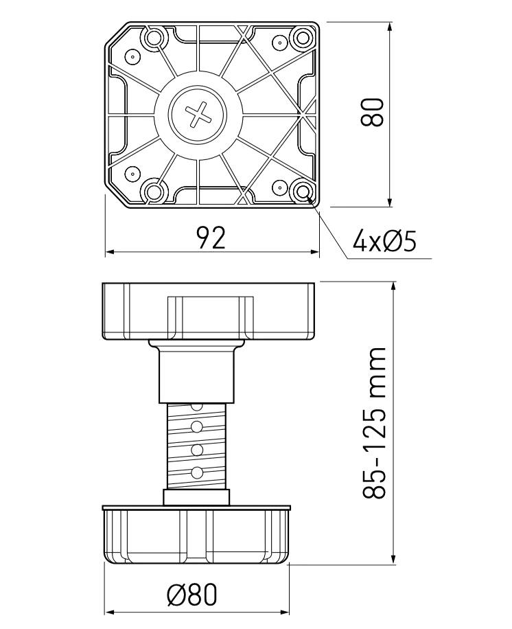 Piciorul este realizat din plastic rezistent, fiind alcătuit din trei componente funcționale: partea superioară cu patru orificii de fixare și nervuri de întărire, corpul cilindric cu filet interior și baza inferioară cu diametru Ø80 mm și filet exterior. Această structură permite susținerea unei sarcini statice de până la 450 kg, asigurând stabilitate ridicată chiar și pentru mobilier greu.