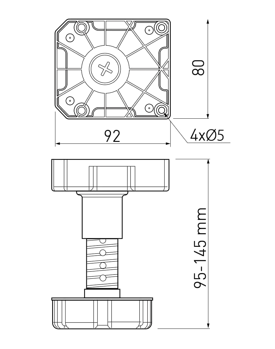 Intervalul de reglaj 95–145 mm permite ajustarea poziției mobilierului și corectarea denivelărilor pardoselii, fără a compromite rezistența. Finisajul negru GT oferă o integrare discretă și profesională, potrivită pentru mobilier de bucătărie, mobilier tehnic sau aplicații industriale.