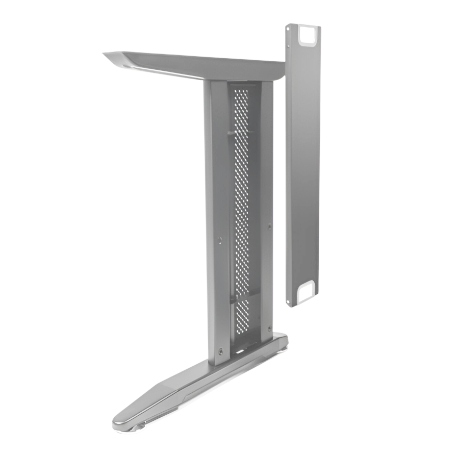 Picioarele sunt echipate cu mecanisme de reglare pe înălțime, permițând ajustarea fină cu până la 10 mm, ideală pentru compensarea denivelărilor pardoselii. Finisajul argintiu oferă un aspect modern, tehnic și ușor de integrat în amenajări office contemporane.