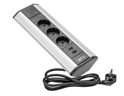 GTV Colt – Priză pentru mobilier, cu 3 prize Schuko și 2 porturi USB, finisaj aluminiu