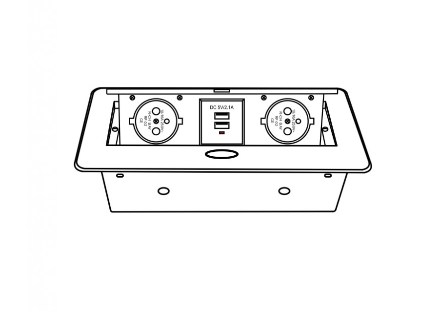 Priza încorporabilă în blat Kombibox, cu 2 prize Schuko, 2 porturi USB și încărcător integrat, este o soluție completă pentru alimentare electrică și încărcare dispozitive direct din mobilier. Designul dreptunghiular permite integrarea eficientă în blaturi de bucătărie, birouri sau mese de lucru, oferind acces rapid și organizat la curent și încărcare, fără prelungitoare vizibile.