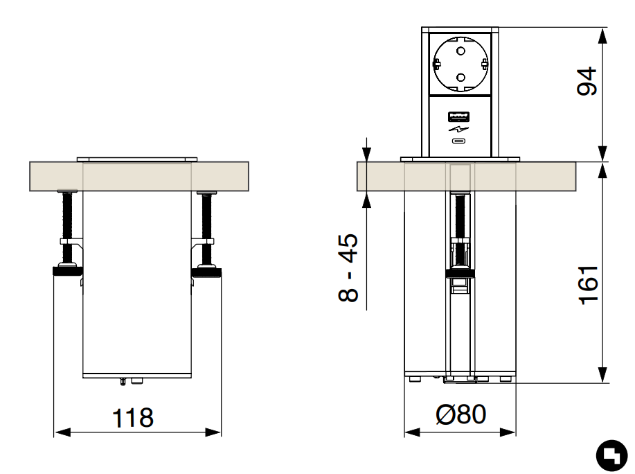 Priza este încorporabilă în blat, prin decupaj dedicat.
