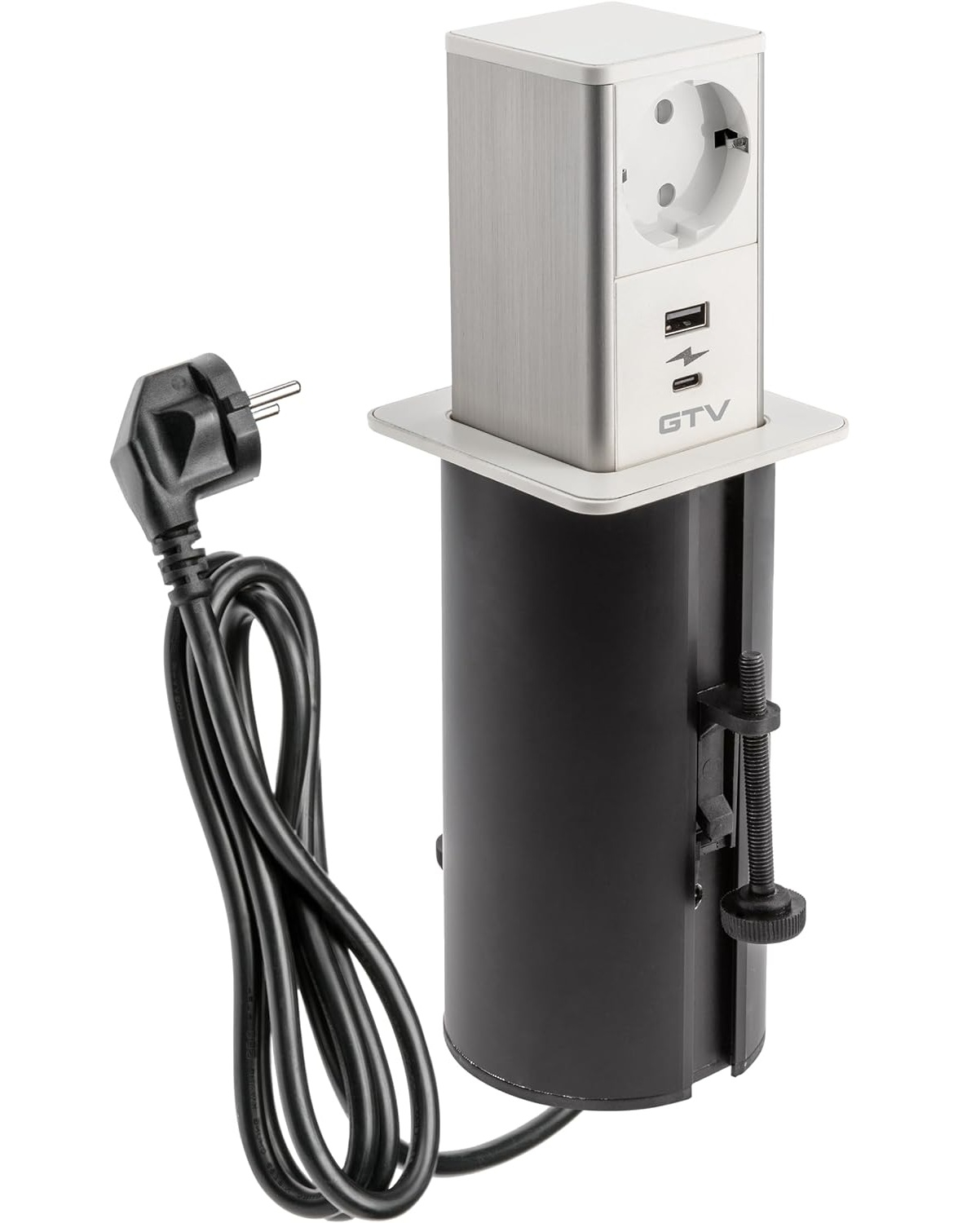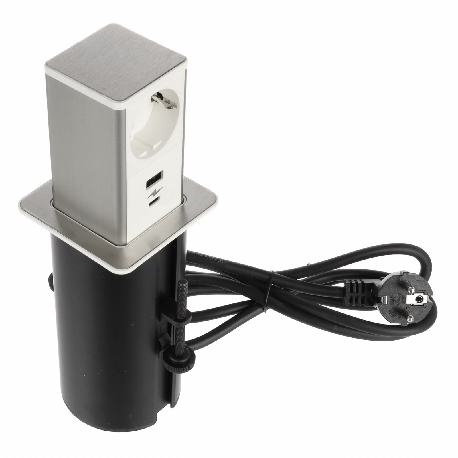 Priza încorporabilă în blat Tower, cu sistem tip coloană extensibilă, este o soluție premium pentru alimentare electrică discretă în spații moderne. Mecanismul vertical permite ridicarea prizei doar la utilizare, iar în poziție închisă aceasta rămâne complet mascată în blat, păstrând un aspect curat și elegant al suprafeței de lucru.